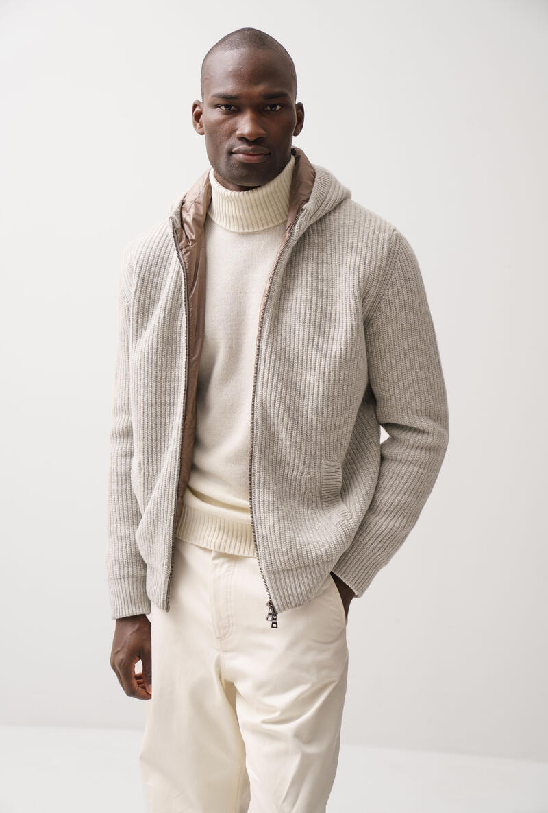 Urban-style zip-up sweatshirt, perfect for facing the cold with comfort and refinement. The wool knit and English ribbing provide structure and warmth. The quilted inner padding ensures thermal protection without weighing down the silhouette. The wraparound hood and double zip complete the look with functionality. The quilted inner padding provides thermal protection without weighing down the silhouette. The wraparound hood and double zip complete the look with functionality.