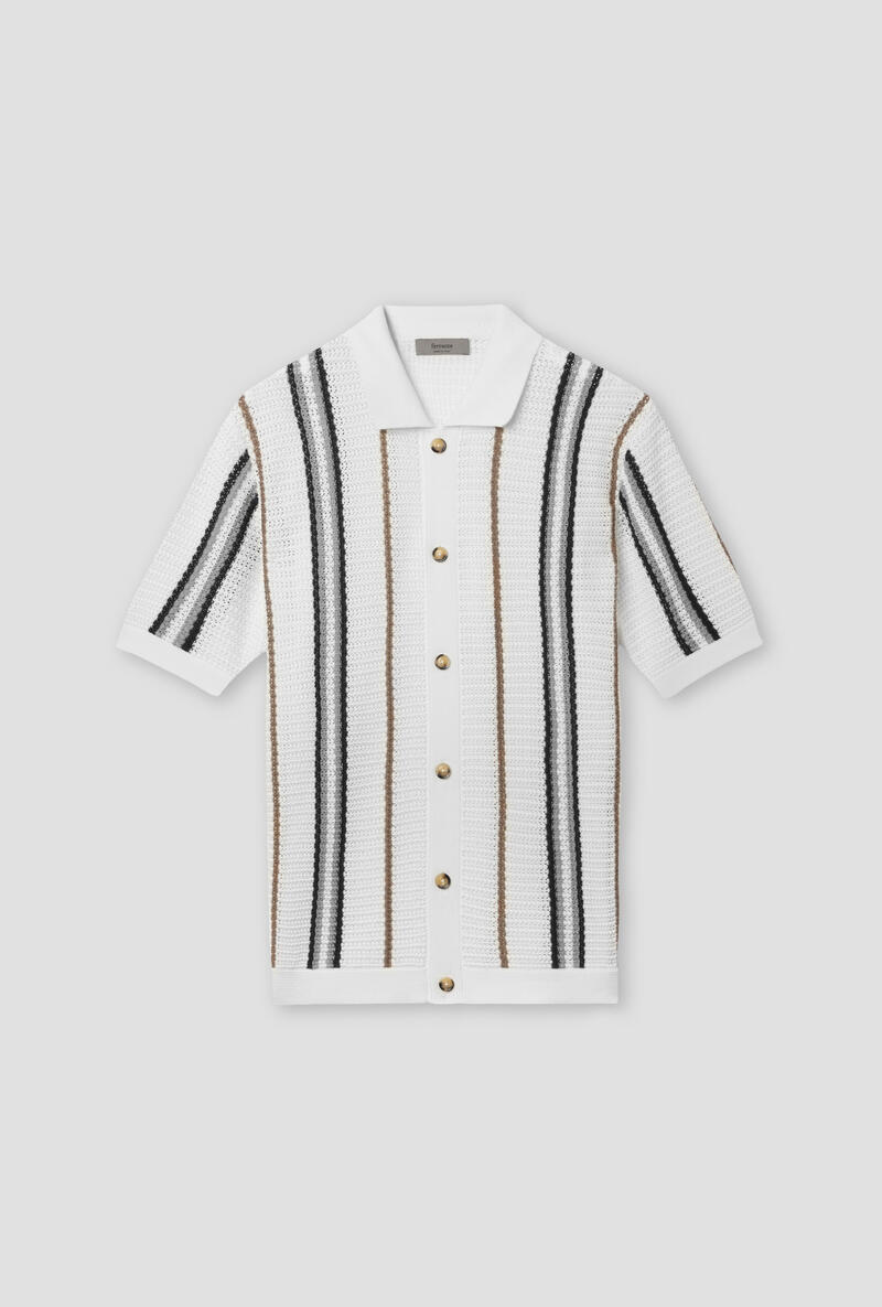 Short-sleeved shirt in pure cotton, featuring vertical stripes that define the design and give the garment a graphic and refined look. The perforated texture and front buttoning enhance a clean and balanced line, designed for an essential yet distinctive style.