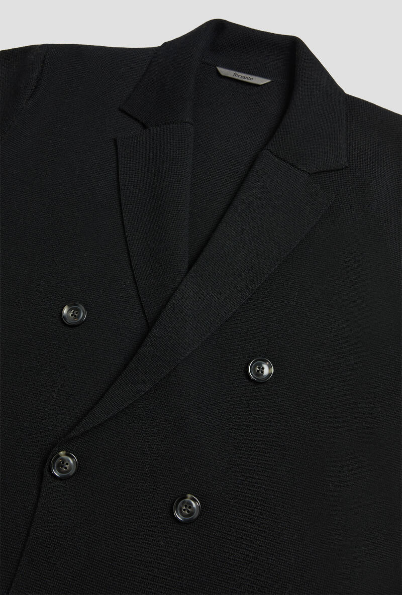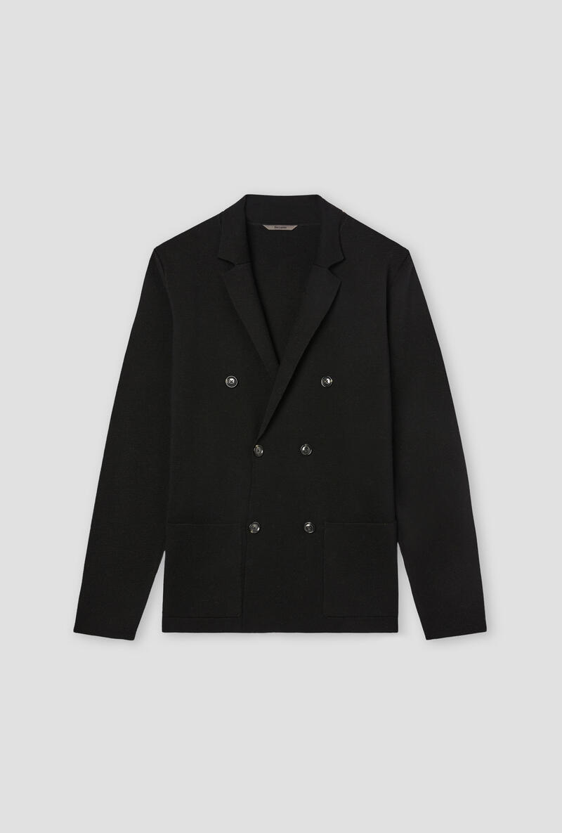 Doppiopetto in maglia che fonde eleganza formale e comfort quotidiano. La lavorazione a punto stoffa valorizza la texture e aggiunge un tocco sobrio e raffinato. Il taglio moderno e destrutturato lo rende ideale per uno stile versatile e contemporaneo.