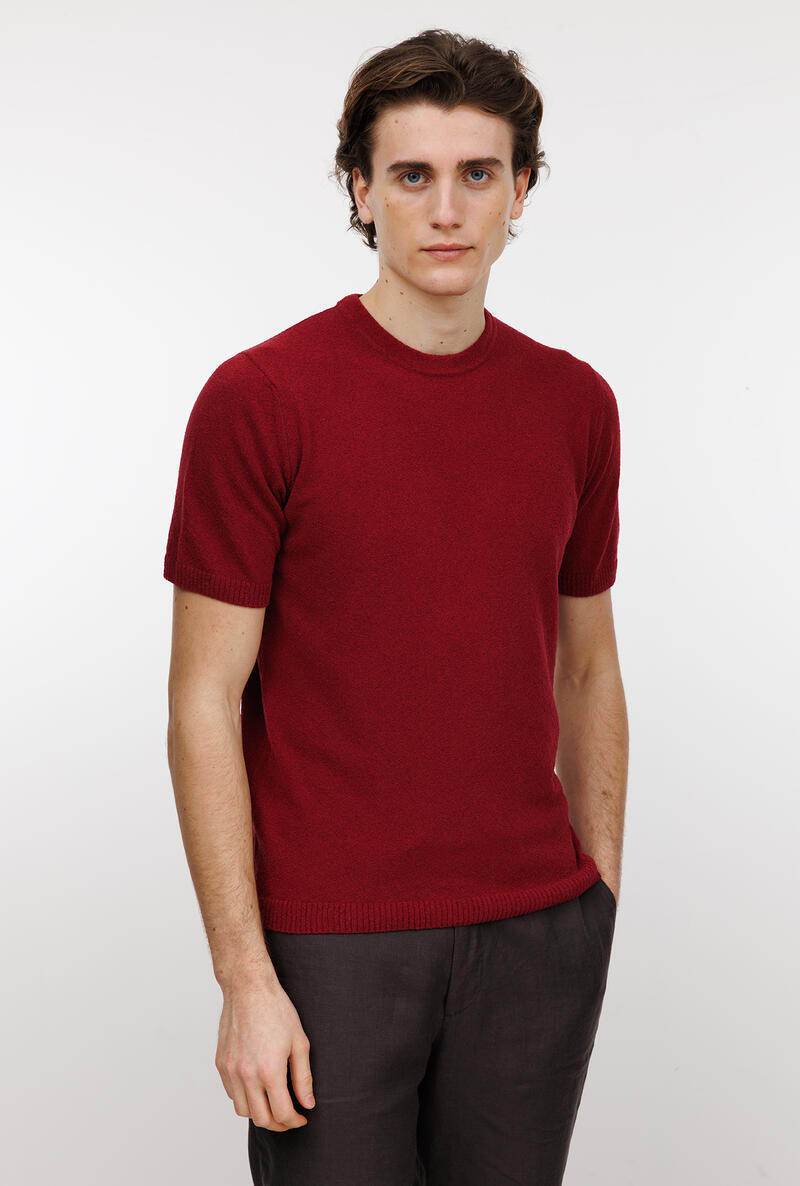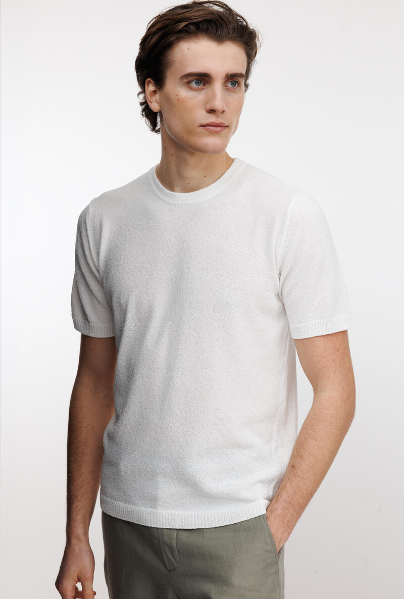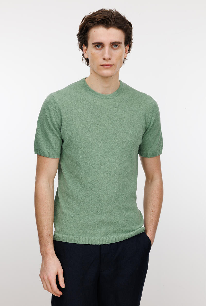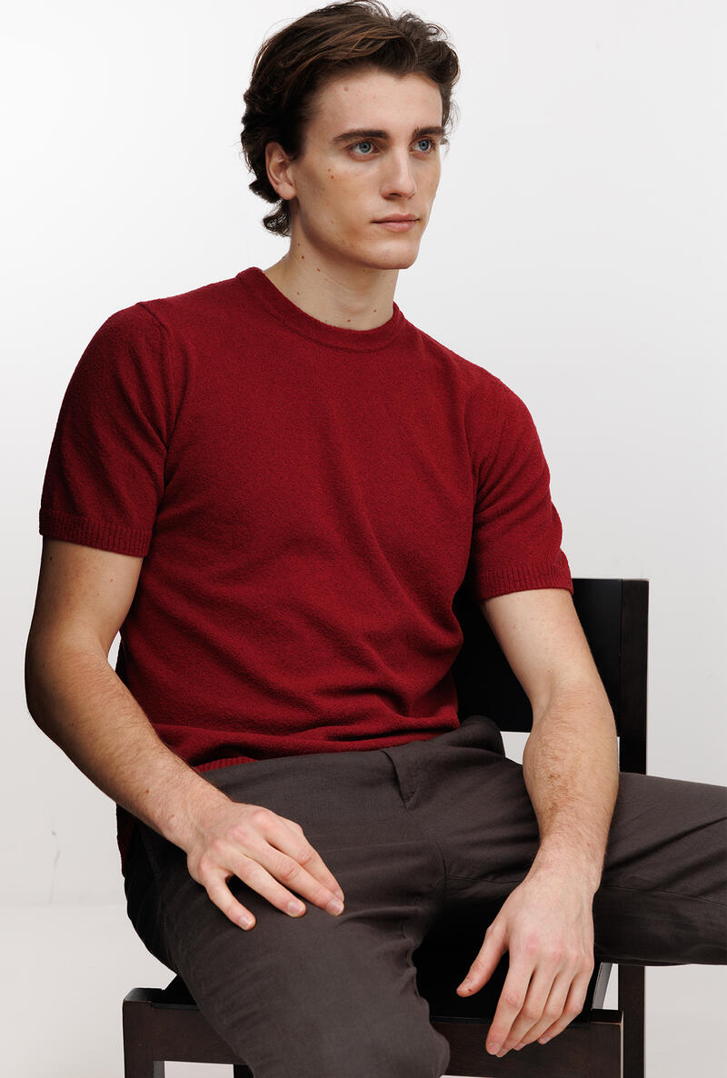 Girocollo bouclè dalla struttura basica e dalla lavorazione comfotevole e fresca. Un capo che arricchisce, un gioiello che dona lusso all'uomo moderno. Una maglia a mezza manica adatta per comporre look sofisticati, per l'uomo che ricerca eleganza anche nella routine quotidiana.
