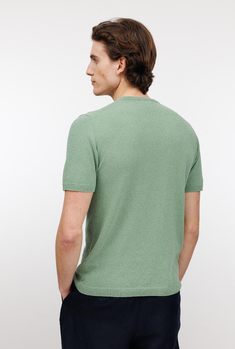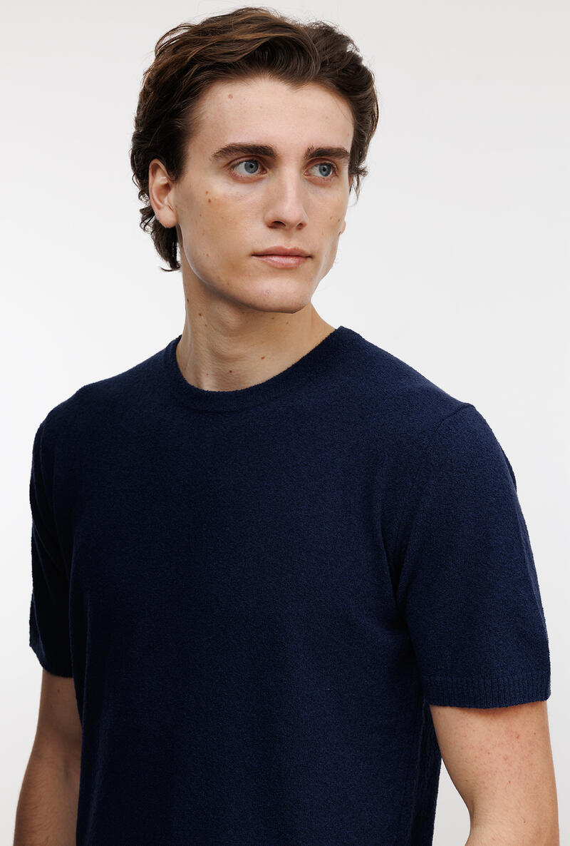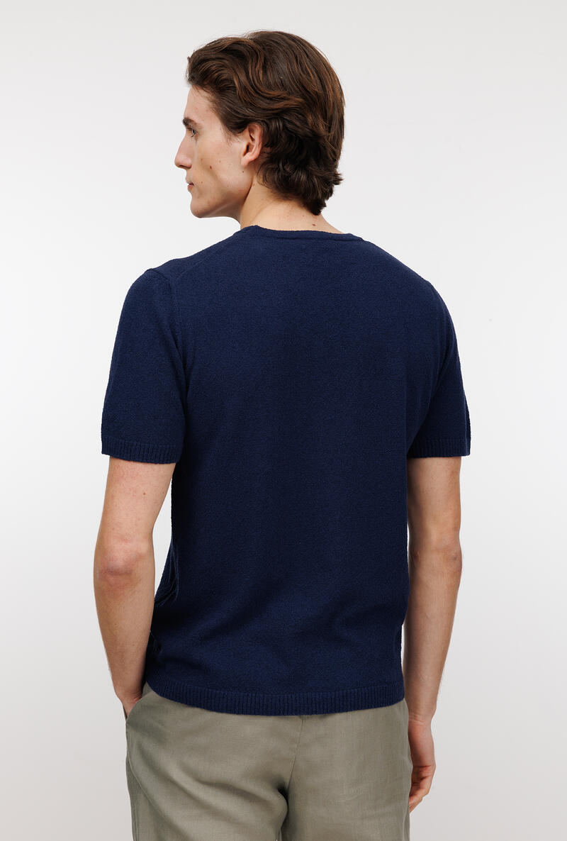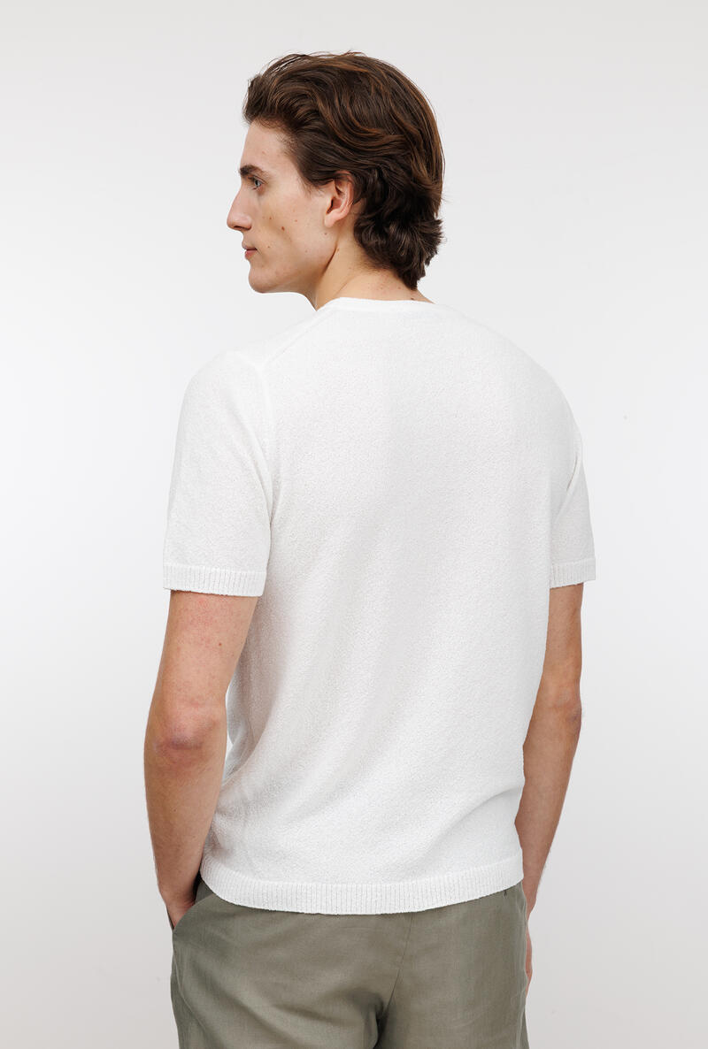 Girocollo bouclè dalla struttura basica e dalla lavorazione comfotevole e fresca. Un capo che arricchisce, un gioiello che dona lusso all'uomo moderno. Una maglia a mezza manica adatta per comporre look sofisticati, per l'uomo che ricerca eleganza anche nella routine quotidiana.
