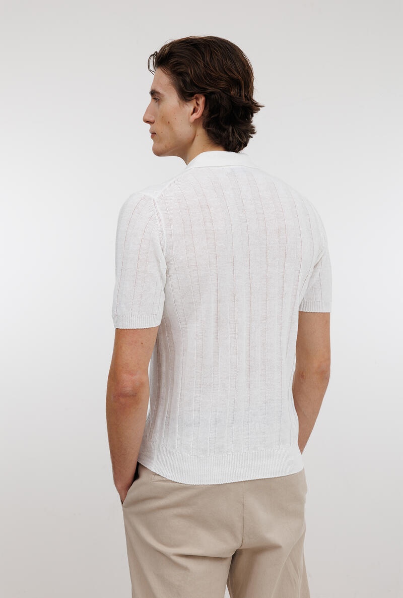 Polo in filato leggero, dal design raffinato e contemporaneo. La lavorazione verticale dona profondità e texture al capo, valorizzandone l’eleganza essenziale. Il modello presenta colletto polo aperto senza bottoni, maniche corte e finiture a costine su fondo e polsini, per una vestibilità regolare e confortevole. Il filato, morbido e piacevole al tatto, garantisce leggerezza e traspirabilità, rendendo il capo ideale per la stagione più calda senza rinunciare a uno stile ricercato ed essenziale.