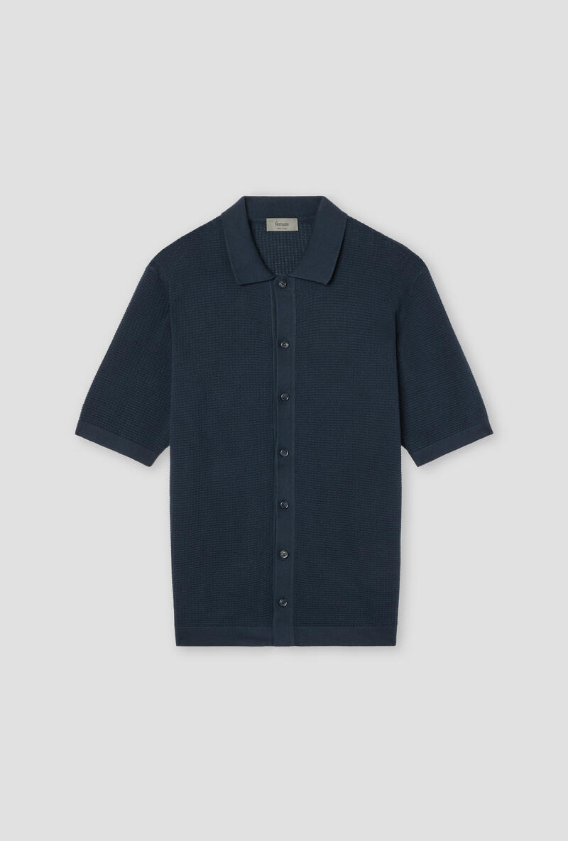 Short-sleeved shirt in pure cotton, featuring a structured knit that gives the garment depth and a refined look. The front button placket and clean lines define an essential and balanced construction, designed for a sober and contemporary style.